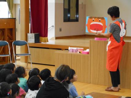 今日は子育て講座として、歯磨き指導を教えにきてくれました。